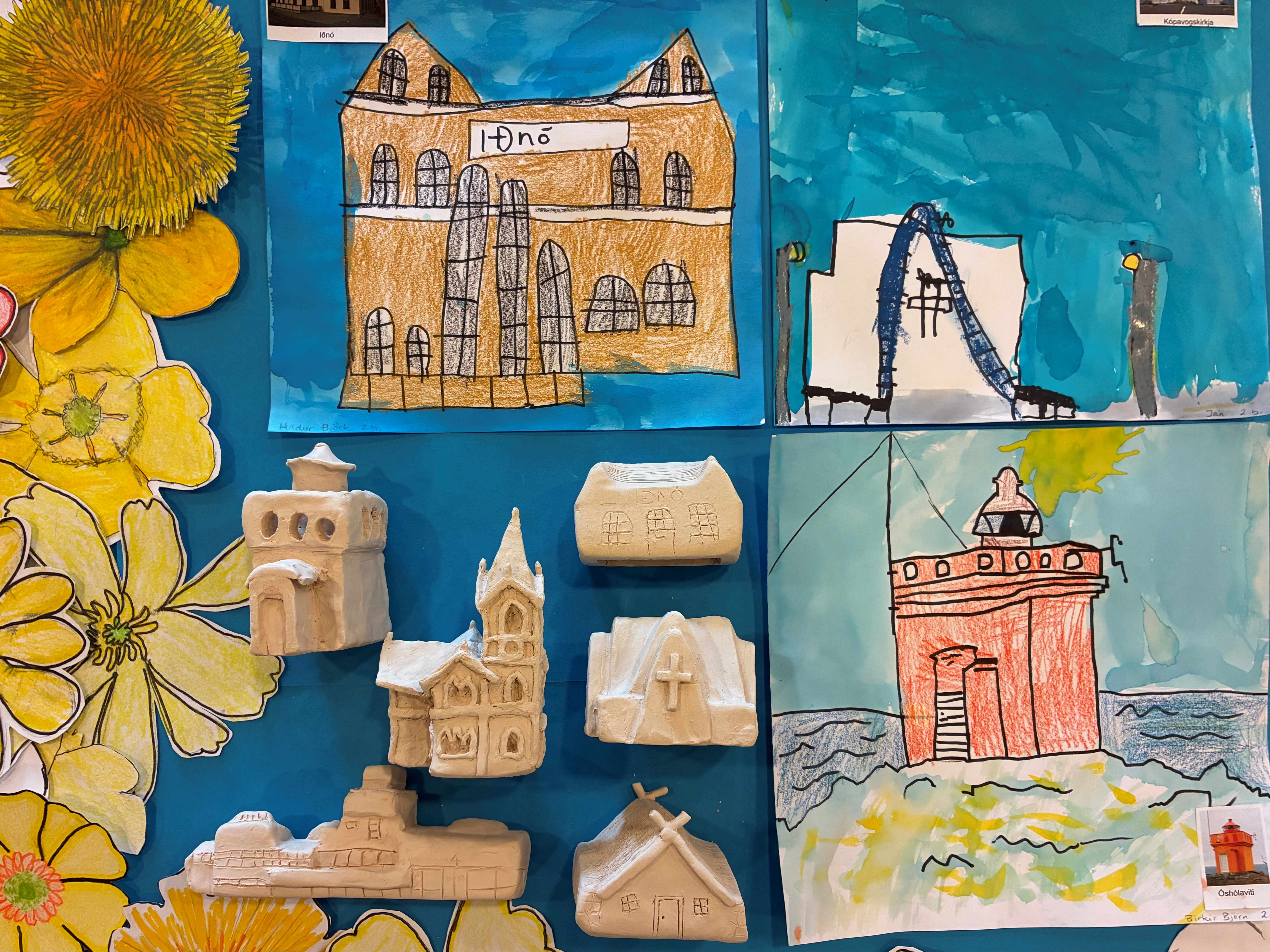 Nemendur á yngsta stigi læra nú um land og þjóð í smiðju og beinum við sjónar okkar að þróun húsa. Við skoðum bók Ölmu Sigurðardóttur, Byggingarnar okkar, þar sem við sjáum hvernig hús hafa þróast frá torfkofum, í steinhús, timburhús og loks steinsteypt hús. Í þeirri vinnu draga nemendur eitt af húsunum sem 10. bekkur valdi og gera teikningu af sama húsi. Þeir fá bæði ljósmynd og leirútgáfuna til að herma eftir.